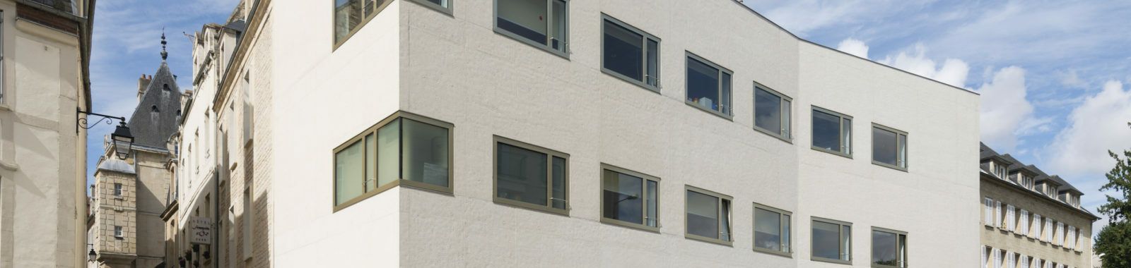 Situé au croisement du centre ancien et de la Rue des Quatrans, le nouveau bâtiment tisse finement un nouveau lien entre l’architecture de la reconstruction et les quartiers historiques de Caen. Cette écriture contemporaine, respectueuse de son contexte, est particulièrement illustrée par la sobriété et la qualité de la façade en béton sablé réalisée par l’entreprise ZANELLO. Le CAUE récompense ainsi le travail partenarial des maitres d’ouvrage, de la maitrise d’œuvre et des entreprises qui ont su imaginer et trouver les meilleures solutions pour répondre aux enjeux de qualité urbaine et architecturale.