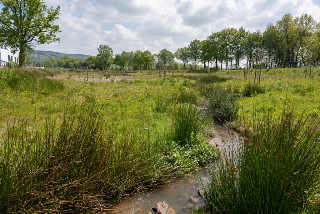 Réalisé sur un site sensible, le projet s’inscrit dans une logique de développement durable : de larges espaces sont réservés aux plantations, tandis que la gestion des eaux pluviales est assurée par des bassins de rétention en surface. Ces aménagements créent de véritables milieux humides, favorisant à la fois le maintien de la faune présente initialement sur le site et l’accueil de nouvelles espèces.