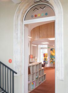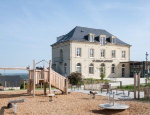 En interface directe avec la place, la Maison Citoyenne a fait l’objet d’une réhabilitation complète et d’une extension dans les locaux de l’ancienne école maternelle. Ouverte au public depuis un an, elle propose sur 825 m² une offre sociale, éducative et culturelle diversifiée : France Services, médiathèque, Micro-Folie, espaces numériques, relais petite enfance, espaces jeunesse.